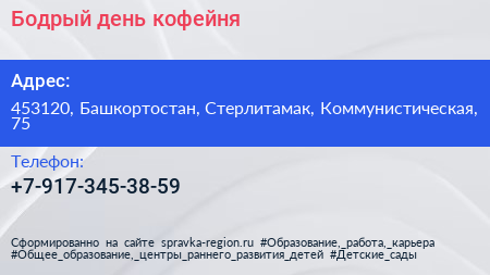 Бодрый день, кофейня по адресу 453120, Башкортостан, Стерлитамак, Коммунистическая, 75 в дальнейшем Организация, размещена в следующих категориях: