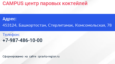 CAMPUS, центр паровых коктейлей по адресу 453124, Башкортостан, Стерлитамак, Комсомольская, 78 в дальнейшем Организация, размещена в следующих категориях: