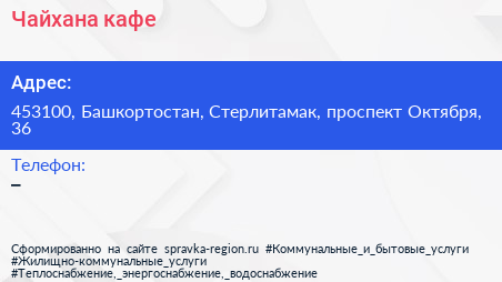 Чайхана, кафе по адресу 453100, Башкортостан, Стерлитамак, проспект Октября, 36 в дальнейшем Организация, размещена в следующих категориях: