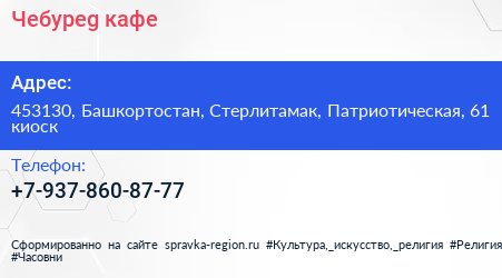 Чебуреg, кафе по адресу 453130, Башкортостан, Стерлитамак, Патриотическая, 61 киоск в дальнейшем Организация, размещена в следующих категориях: