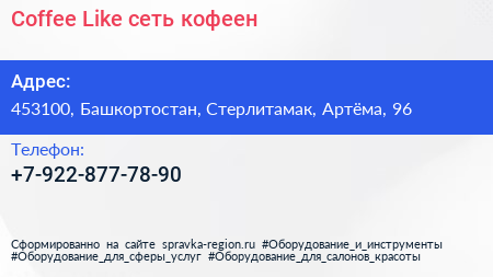 Coffee Like, сеть кофеен по адресу 453100, Башкортостан, Стерлитамак, Артёма, 96 в дальнейшем Организация, размещена в следующих категориях: