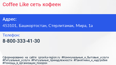 Coffee Like, сеть кофеен по адресу 453101, Башкортостан, Стерлитамак, Мира, 1а в дальнейшем Организация, размещена в следующих категориях: