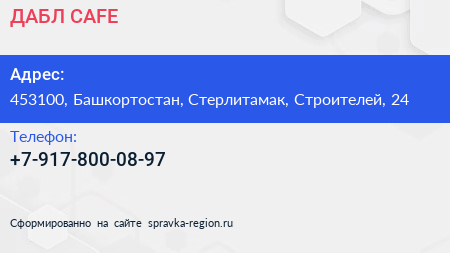 ДАБЛ CAFE по адресу 453100, Башкортостан, Стерлитамак, Строителей, 24 в дальнейшем Организация, размещена в следующих категориях: