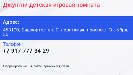 Джунгли, детская игровая комната по адресу 453100, Башкортостан, Стерлитамак, проспект Октября, 36 в дальнейшем Организация, размещена в следующих категориях: