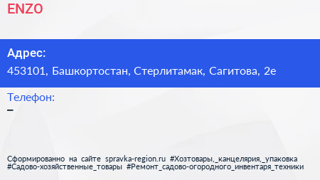 ENZO по адресу 453101, Башкортостан, Стерлитамак, Сагитова, 2е в дальнейшем Организация, размещена в следующих категориях: