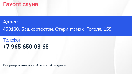 Favorit, сауна по адресу 453130, Башкортостан, Стерлитамак, Гоголя, 155 в дальнейшем Организация, размещена в следующих категориях: