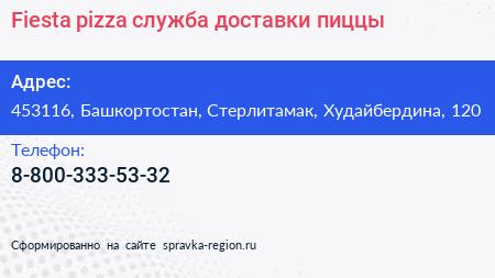 Fiesta pizza, служба доставки пиццы по адресу 453116, Башкортостан, Стерлитамак, Худайбердина, 120 в дальнейшем Организация, размещена в следующих категориях:
