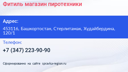 Фитиль, магазин пиротехники по адресу 453116, Башкортостан, Стерлитамак, Худайбердина, 120/1 в дальнейшем Организация, размещена в следующих категориях: