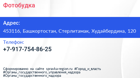 Фотобудка по адресу 453116, Башкортостан, Стерлитамак, Худайбердина, 120 в дальнейшем Организация, размещена в следующих категориях: