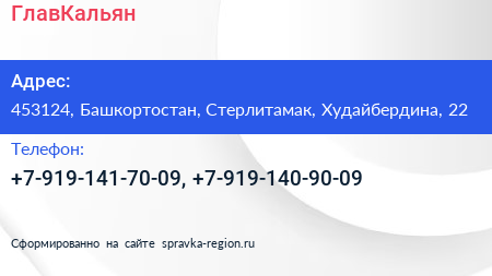 ГлавКальян по адресу 453124, Башкортостан, Стерлитамак, Худайбердина, 22 в дальнейшем Организация, размещена в следующих категориях: