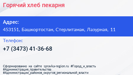 Горячий хлеб, пекарня по адресу 453151, Башкортостан, Стерлитамак, Лазурная, 11 в дальнейшем Организация, размещена в следующих категориях:
