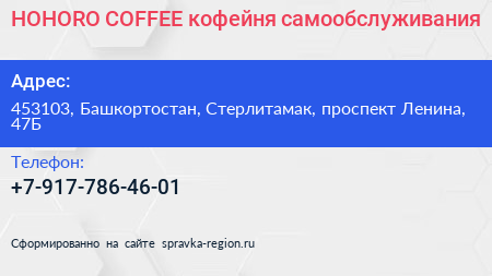 HOHORO COFFEE, кофейня самообслуживания по адресу 453103, Башкортостан, Стерлитамак, проспект Ленина, 47Б в дальнейшем Организация, размещена в следующих категориях: