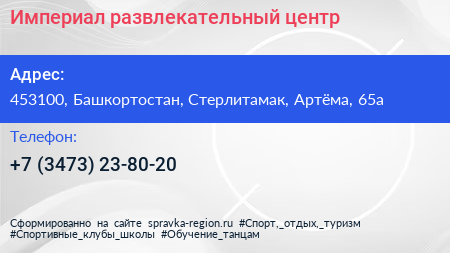 Империал, развлекательный центр по адресу 453100, Башкортостан, Стерлитамак, Артёма, 65а в дальнейшем Организация, размещена в следующих категориях: