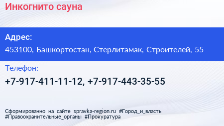 Инкогнито, сауна по адресу 453100, Башкортостан, Стерлитамак, Строителей, 55 в дальнейшем Организация, размещена в следующих категориях: