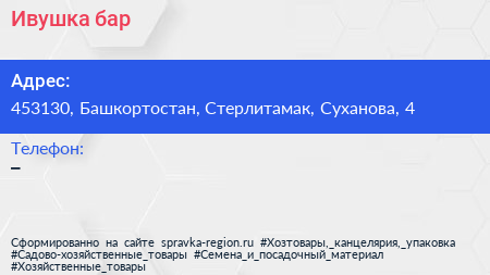 Ивушка, бар по адресу 453130, Башкортостан, Стерлитамак, Суханова, 4 в дальнейшем Организация, размещена в следующих категориях: