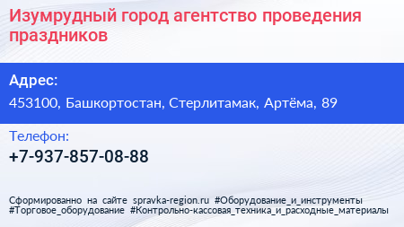 Изумрудный город, агентство проведения праздников по адресу 453100, Башкортостан, Стерлитамак, Артёма, 89 в дальнейшем Организация, размещена в следующих категориях: