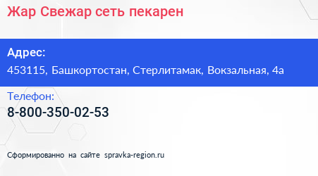 Жар Свежар, сеть пекарен по адресу 453115, Башкортостан, Стерлитамак, Вокзальная, 4а в дальнейшем Организация, размещена в следующих категориях: