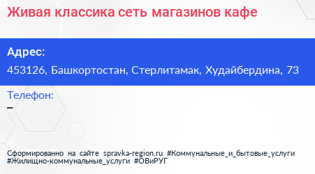 Живая классика, сеть магазинов-кафе по адресу 453126, Башкортостан, Стерлитамак, Худайбердина, 73 в дальнейшем Организация, размещена в следующих категориях: