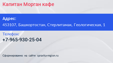 Капитан Морган, кафе по адресу 453107, Башкортостан, Стерлитамак, Геологическая, 1 в дальнейшем Организация, размещена в следующих категориях: