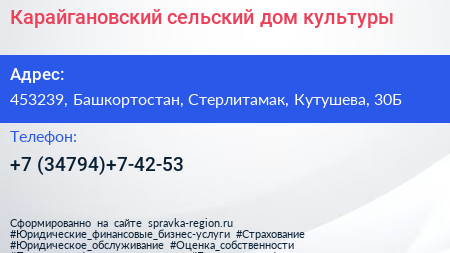Карайгановский сельский дом культуры по адресу 453239, Башкортостан, Стерлитамак, Кутушева, 30Б в дальнейшем Организация, размещена в следующих категориях: