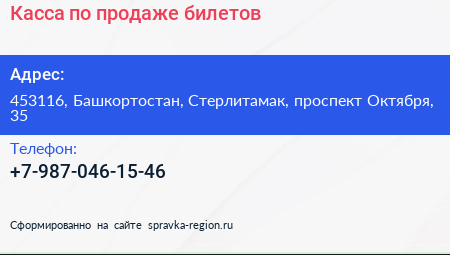 Касса по продаже билетов по адресу 453116, Башкортостан, Стерлитамак, проспект Октября, 35 в дальнейшем Организация, размещена в следующих категориях: