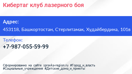 Кибертаг, клуб лазерного боя по адресу 453118, Башкортостан, Стерлитамак, Худайбердина, 101в в дальнейшем Организация, размещена в следующих категориях: