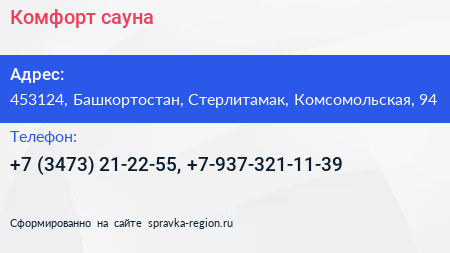 Комфорт, сауна по адресу 453124, Башкортостан, Стерлитамак, Комсомольская, 94 в дальнейшем Организация, размещена в следующих категориях: