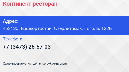 Континент, ресторан по адресу 453130, Башкортостан, Стерлитамак, Гоголя, 122Б в дальнейшем Организация, размещена в следующих категориях: