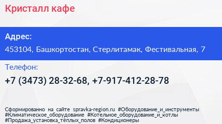 Кристалл, кафе по адресу 453104, Башкортостан, Стерлитамак, Фестивальная, 7 в дальнейшем Организация, размещена в следующих категориях: