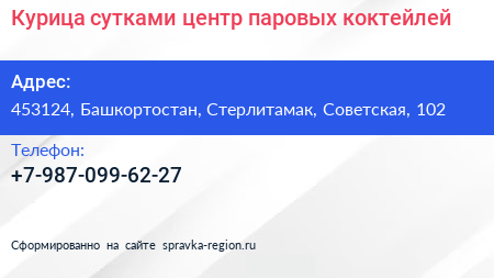 Курица сутками, центр паровых коктейлей по адресу 453124, Башкортостан, Стерлитамак, Советская, 102 в дальнейшем Организация, размещена в следующих категориях: