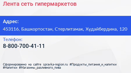 Лента, сеть гипермаркетов по адресу 453116, Башкортостан, Стерлитамак, Худайбердина, 120 в дальнейшем Организация, размещена в следующих категориях:
