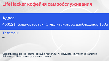 LifeHacker, кофейня самообслуживания по адресу 453121, Башкортостан, Стерлитамак, Худайбердина, 150а в дальнейшем Организация, размещена в следующих категориях: