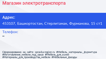 Магазин электротранспорта по адресу 453107, Башкортостан, Стерлитамак, Фурманова, 15 ст1 в дальнейшем Организация, размещена в следующих категориях: