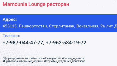 Mamounia Lounge, ресторан по адресу 453115, Башкортостан, Стерлитамак, Вокзальная, 9а лит Д в дальнейшем Организация, размещена в следующих категориях: