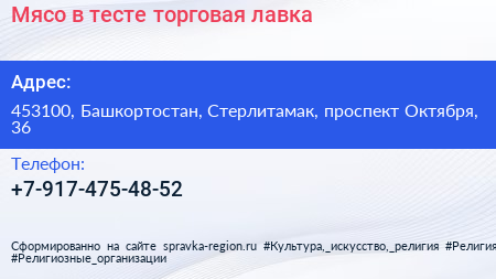 Мясо в тесте, торговая лавка по адресу 453100, Башкортостан, Стерлитамак, проспект Октября, 36 в дальнейшем Организация, размещена в следующих категориях: