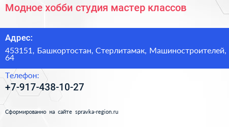 Модное хобби, студия мастер-классов по адресу 453151, Башкортостан, Стерлитамак, Машиностроителей, 64 в дальнейшем Организация, размещена в следующих категориях: