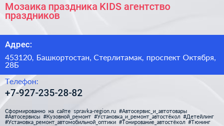 Мозаика праздника KIDS, агентство праздников по адресу 453120, Башкортостан, Стерлитамак, проспект Октября, 28Б в дальнейшем Организация, размещена в следующих категориях: