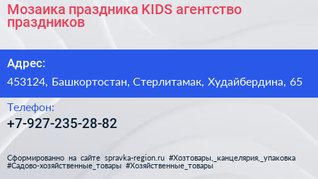 Мозаика праздника KIDS, агентство праздников по адресу 453124, Башкортостан, Стерлитамак, Худайбердина, 65 в дальнейшем Организация, размещена в следующих категориях: