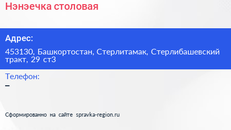 Нэнэечка, столовая по адресу 453130, Башкортостан, Стерлитамак, Стерлибашевский тракт, 29 ст3 в дальнейшем Организация, размещена в следующих категориях: