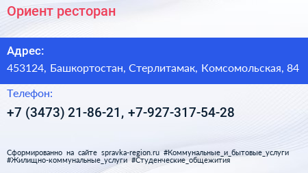 Ориент, ресторан по адресу 453124, Башкортостан, Стерлитамак, Комсомольская, 84 в дальнейшем Организация, размещена в следующих категориях: