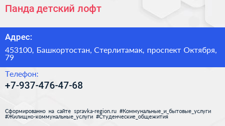 Панда, детский лофт по адресу 453100, Башкортостан, Стерлитамак, проспект Октября, 79 в дальнейшем Организация, размещена в следующих категориях: