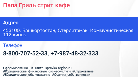 Папа Гриль, стрит-кафе по адресу 453100, Башкортостан, Стерлитамак, Коммунистическая, 112 киоск в дальнейшем Организация, размещена в следующих категориях: