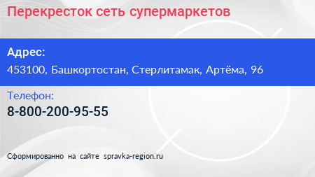Перекресток, сеть супермаркетов по адресу 453100, Башкортостан, Стерлитамак, Артёма, 96 в дальнейшем Организация, размещена в следующих категориях: