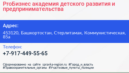 ProБизнес, академия детского развития и предпринимательства по адресу 453120, Башкортостан, Стерлитамак, Коммунистическая, 85а в дальнейшем Организация, размещена в следующих категориях: