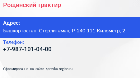 Рощинский, трактир по адресу Башкортостан, Стерлитамак, Р-240 111 Километр, 2 в дальнейшем Организация, размещена в следующих категориях: