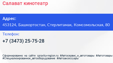 Салават, кинотеатр по адресу 453124, Башкортостан, Стерлитамак, Комсомольская, 80 в дальнейшем Организация, размещена в следующих категориях: