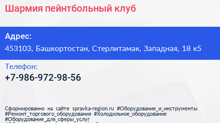 Шармия, пейнтбольный клуб по адресу 453103, Башкортостан, Стерлитамак, Западная, 18 к5 в дальнейшем Организация, размещена в следующих категориях: