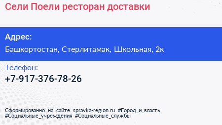 Сели & Поели, ресторан доставки по адресу Башкортостан, Стерлитамак, Школьная, 2к в дальнейшем Организация, размещена в следующих категориях: