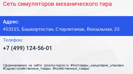 Сеть симуляторов механического тира по адресу 453115, Башкортостан, Стерлитамак, Вокзальная, 23 в дальнейшем Организация, размещена в следующих категориях: