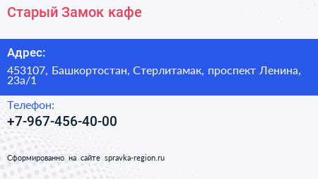 Старый Замок, кафе по адресу 453107, Башкортостан, Стерлитамак, проспект Ленина, 23а/1 в дальнейшем Организация, размещена в следующих категориях: